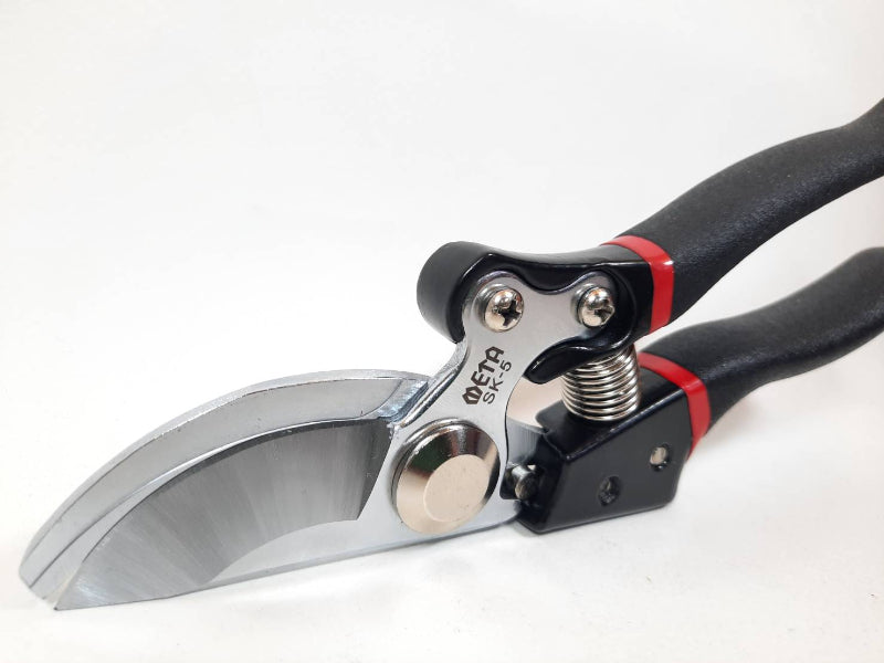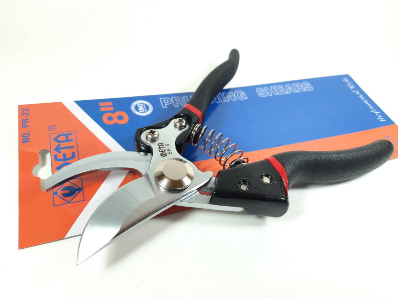กรรไกรตัดกิ่งไม้ META (SK5) No.PR-22  META PRUNER No.PR-22 สำหรับตัดแต่งกิ่งไม้ ตัวใบมีดของกรรไกรทำจากสแตนเลสเกรดคุณภาพทำให้สามารถลับคมมีดให้มีความคมสูงและสามารถใช้ได้เป็นระยะเวลานานกว่าคมมีดจะต้องลับใหม่ ด้ามจับของกรรไกรทำจากพลาสติกABSอย่างดีทนทานต่อการใช้งานและแรงกระแทกที่อาจเกิดขึ้นได้เมื่อกรรไกรตกพื้น ด้ามของกรรไกรมียางสีแดงที่ช่วยให้การจับกระชับและไม่ลื่นหลุดง่ายเวลาใช้งาน ก่อนใช้งานให้ปลดล็อคที่ปลายล่างของกรรไกรก่อนและบีบเพื่อตัด กรรไกรถูกออกแบบมาเพื่อใช้ในการตัดแต่งกิ่งไม้ รอยตัดที่ใช้กรรไกรตัดกิ่ง META (SK5) No.PR-22  นี้จะมีความคมไม่ช้ำเหมาะกับการเพาะชำกิ่ง หรือใช้ในการตัดเก็บเกี่ยวพืชผลทางการเกษตร ด้ามจับมีความกระชับ น้ำหนักเบา
