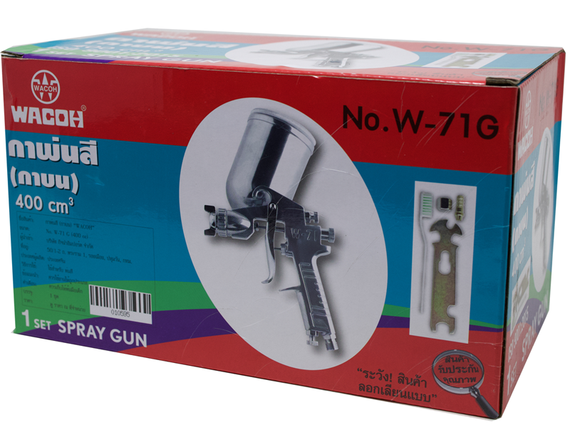 WACOH Spray Gun No.W-71G 400 cm. สำหรับพ่นสี,พ่นแล็คเกอร์ ตัวกระป๋องกาพ่นทำจากอลูมิเนียมหนาคุณภาพสูง ตัวก้านจับทำจากสแตนเลสและซิงค์ขึ้นรูป วิธีการใช้ เสียบสายลมเข้าทางด้านก้านจับของกาพ่นสี ทำการปรับระยะกดตรงด้านท้ายของด้ามจับเพื่อกำหนดระยะและประมาณลมที่จะออกมาพร้อมกับเนื้อสีที่ใส่อยู่ในกาพ่นสี ตรงปากพ่นสีสามารถหมุนเพื่อปรับการกระจายตัวของสีที่พ่นออกมาได้ ในชุดที่ให้มาจะประกอบไปด้วย กาพ่นสี ข้อต่อสายแบบcouplerซึ่งเป็นแบบต่อสวมเร็ว ข้อต่อแบบเสียบสายลม กิ๊บรัดท่อซึ่งใช้กับข้อต่อแบบเสียบสายลม และประแจเอนกประสงค์สามารถใช้ในการไขเพื่อปรับให้ชิ้นส่วนกาพ่นสีให้แน่นหรือถอดออกเพื่อทำความสะอาด ถ้วยกาพ่นสีสามารถบรรจุสีได้ 400 มล.